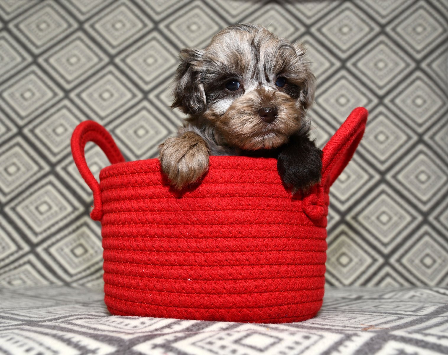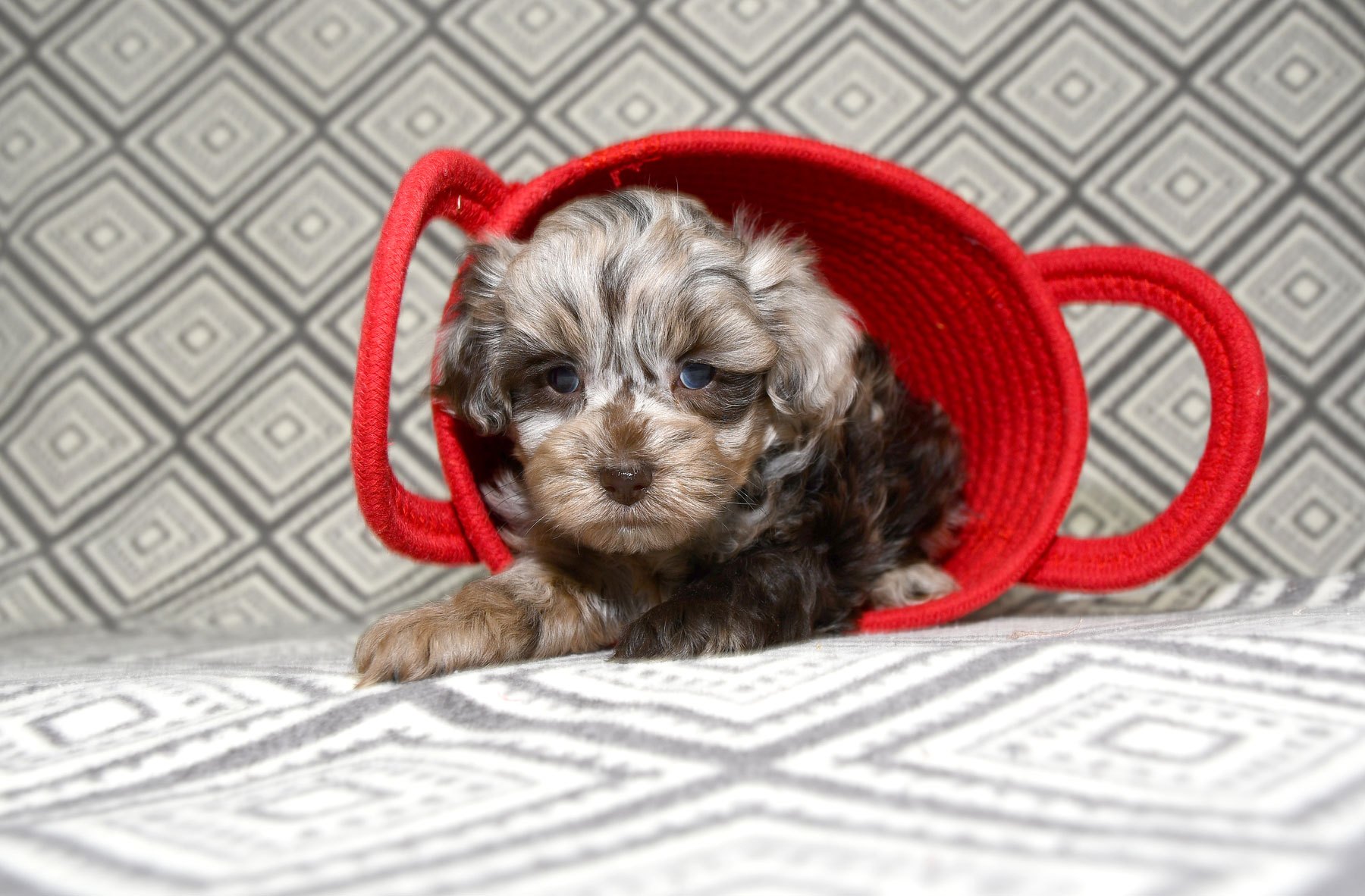 Avery was born here and was a full sister to Carmel and Shasta who have been retired. Avery has a fabulous disposition and is a happy little gal! Avery loves the play yard and truly enjoys getting to play together with everyone when they get out in the play yard. Cricket’s their mother was just a joy to have and I know the family that has her is super happy with her. Avery has such a loving personality and gets along with everyone. The added plus is she is such a dream to groom. We have paired her with Coby our 8 to 9lb Chocolate merle Schnauzer. You can read more about him on the parents page under the gent’s.